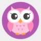 Sticker featuring a cute, pink cartoon baby owl on purple background. Fun design for girls.