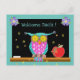 A cute and cheerful postcard to welcome kindergartners students to school . The front of the postcard has a pretty colourful owl standing ahead of a chalkboard and next to a red apple . On the top it says "Welcome back!" . On the back is a text template with all the information for the first day of school . Modify it to fit your needs . There is also a line to add the teacher name and the room number .