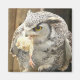 A great owl clutches a small downy feathered yellow chick in it's beak. This photograph captured every last detail from the flecks in the owl's enormous eyes to the tiny feathers and talons of the prey. It was taken at the zoo, in a wildlife bird sanctuary and rescue exhibit.