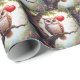 A fluffy owl with large expressive eyes perches on a tree branch, holding a red heart-shaped balloon