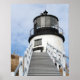 A unique perspective looking up at the lighthouse from the bottom of the stairs leading to it. Th white and black lighthouse stands out from the blue Sky's behind behind it and light brown colour of the early spring grass. A perfect addition to any lighthouse lovers collection.