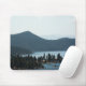 A photograph of the surrounding pine tree covered mountains coming to an end at Lake Tahoe.