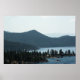 A photograph of the surrounding pine tree covered mountains coming to an end at Lake Tahoe.