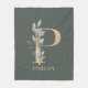 Letter P monogram floral. Letter P in golden brown texture accented with green watercolor compound leaves, flower blossoms and gold dust. Personalised with name in matching font.
