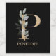 Letter P monogram floral. Letter P in golden brown texture accented with green watercolor compound leaves, flower blossoms and gold dust. Personalised with name in matching font.