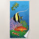 Colourful fine art design of Pacific coral reef, fish and creatures by nature artist Carolyn McFann of Two Purring Cats Studio on a quality, sublimation printed for vivid, durable colour beach towel. It's a generous size, perfect for pool, home bath or beachfront relaxation.