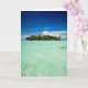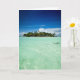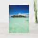 Greeting card with a desert or uninhabited adventure Island with palm trees and a dark blue sky in the turquoise water of a lagoon in the Pacific archipelago French Polynesia.