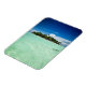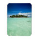 Vertical photo magnet with a desert or uninhabited adventure Island with palm trees and a dark blue sky in the turquoise water of a lagoon in the Pacific archipelago French Polynesia