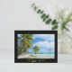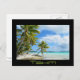 Postcard with a hanging palm tree on a white sand beach on a small desert island in the blue lagoon of tropical Rangiroa, an atoll of the Tahiti archipelago French Polynesia in the Pacific ocean with a black border and the text: 'Tahiti'.