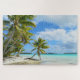 Photo jigsaw puzzle with some hanging palm trees and a white sand beach on a small desert island in the blue lagoon of tropical Rangiroa, an atoll of the Tahiti archipelago French Polynesia in the Pacific ocean.