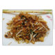 Pad Thai [ผัดไทย] or Phat Thai is a stir-fried rice noodle dish commonly served as a street food and at casual local eateries in Thailand. It is made with soaked dried rice noodles, which are stir-fried with eggs and chopped firm tofu, and flavoued with tamarind pulp, fish sauce, dried shrimp, garlic or shallots, red chilli pepper and palm sugar, and served with lime wedges and often chopped roast peanuts. It may also contain other vegetables like bean sprouts, garlic chives, coriander leaves, pickled radishes or turnips, and raw banana flowers. It may also contain fresh shrimp, crab, chicken or another protein. Vegetarian versions may substitute soy sauce for the fish sauce and omit the shrimp.