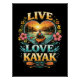 A serene heart-shaped lakeside scene celebrates the love of kayaking amid mountains, flowers, and golden sunset skies.