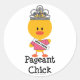 A cute chick in a pink tee and Miss Chick sash wears a tiara beauty pageant crown on her head on these cute and funny Pageant Chick t-shirts, tees, tote bags, apparel and gifts for her. These items make a cute gift for a beauty queen contestant. Artwork © Chrissy H. Studios, LLC. All Rights Reserved.