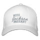 Shown in white with a two-tone embroidered text [miss is in a slightly lighter colour] in blue colours. This cap has front text shown with name of pageant, back text is shown with the year and the side text is shown with city and state. Customise this item and remember to choose your hat colour.