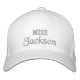 Shown in white with a two-tone embroidered text [miss is in a slightly lighter colour] in blue colours. This cap has front text shown with name of pageant, back text is shown with the year and the side text is shown with city and state. Customise this item and remember to choose your hat colour.