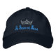 Shown in Navy cap with the embroidered text in turquoise blue and crown in silver Isacord. This cap has front text only. Adjustable back.