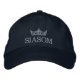 Shown in White cap with the embroidered text in blue and crown in silver Isacord. Caption reads: SIASOM (success is a state of mind or mine).