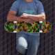 This paint splattered board looks a little like abstract modern art and a little like graffiti gone wild. This deck has bright colours on a black background.