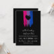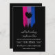 Charming bi wedding invitation with pink, purple and blue bi flag drawn with messy strokes and adorned with a black heart against a black background.