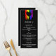 Charming lgbt wedding menu with rainbow pride flag drawn with messy strokes and adorned with a black heart against a black background. Gay wedding menu in black with a heart and rainbow brush strokes. Lesbian wedding menu with a heart on rainbow coloured brushstrokes.