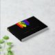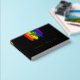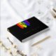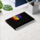 Charming lgbtq wedding guest book with rainbow pride flag drawn with messy strokes and adorned with a gold foil heart against a black background. Gay wedding guest book in black with a heart and rainbow brush strokes and custom gold foil text. Lesbian wedding guestbook with a heart on rainbow coloured brushstrokes.