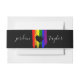 Charming lgbt wedding belly band with rainbow pride flag drawn with messy strokes and adorned with a black heart against a black background and your names in a white script.