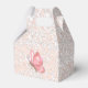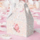 Tent with Ribbon Favour Box.Pink butterfly on pink blossoms. There is a discreet pink balloon behind the butterfly.