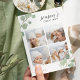 Share holiday greetings with these chic Christmas photo collage cards featuring four of your favourite square photo framed at the top and bottom by painted watercolor eucalyptus leaves in pastel sage green. "Season's Greetings" appears at the top right in an elegant mix of calligraphy and modern lettering, and the year is neatly tucked into one of the leaves. Personalise with your family name at the lower left.