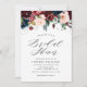 An elegant design with black script lettering and burgundy navy and blush watercolor flowers.