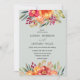 The elegant and rustic design features a wreath of beautiful painted acrylic flowers in blush pink orange and yellow, with pops of colourful purple and green leaves and foliage.