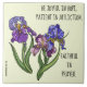 Pretty decorative floral tile (purple iris on pale yellow background) with scripture verse from Romans 12:12