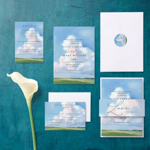 This elegant wedding return address label (or rsvp mailing label) features a beautiful painted landscape background with blue sky, white clouds, a green field, and elegant typography. It's the perfect design for a rustic yet elegant spring or summer wedding. See the collection for coordinating items.