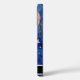 Showcasing a rich blue backdrop with visible, thick brushstrokes, this phone cover is adorned with artistic white stars and gracefully curved crescent moons hinting at dawn's colours. It offers a captivating celestial landscape for your device. A black bar at the base provides a space for personalisation with a name, like "Elizabeth"; should you wish, you can easily remove the name and any other design elements using our intuitive design tool, ensuring your accessory is perfectly customised to your taste