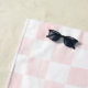This beach towel has a pretty checkerboard print. With illustrations of painted pastel pink squares alternated with plain white squares. The lower edge of the towel is ready to be personalized with a name (or other custom text) in black script lettering.