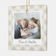 A sweet double sided photo ornament displaying a favourite photo on each side, on a handpainted neutral light plaid background. Personalise with a custom caption on the front in handwritten lettering, and add the year to the back.