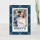 Spread holiday cheer to family and friends with our Painted Plaid holiday photo card. The modern holiday greeting card features your favourite vertical photo on the front framed in white with a background of painted navy plaid with faux silver foil lines. The word "merry" is displayed in a navy retro-inspired font with your greeting and name below. The inside of the folded holiday card features your custom message in navy text. The back of the plaid holiday card features an additional photo. Designed to coordinate with our Painted Plaid holiday collection.