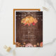 This postcard invitation is a great way to include a personal message with the design quality of a traditional invitation! This design features a wooden background texture with string lights at the top, with an arrangement of red and orange leaves and a pumpkin below. Under the pumpkin bouquet is your invitation typography, in a blend of rustic script and vintage lettering. At the bottom of the page are some more fall-themed leaves and flowers. To customise this invite, just click the blue "personalise" button at the top and type your details into the text boxes that appear.