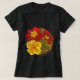 Painted red, green, and yellow spring floral fine art ladies t-shirt. This stunning primrose is painted on coloured board in gouache by Sarah Trett. www.sarahtrett.com