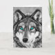 Featuring a black and white version of an acrylic painting of a grey wolf with blue eyes.