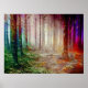 A whimsical forest scene with pale birch-like trees and splashes of rich green, red, and violet.