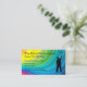Professional painter business card design in a unique and colourful style with a rainbow of colours background graphic and painter holding a paint roller and handle. Designed for a commercial or residential painting service.