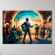 A captivating jazz painting transports viewers to a retro-style cafe where a lively music performance is in full swing. The vintage atmosphere is alive with the sounds of a bluesy jazz song, performed by a talented orchestra or band.