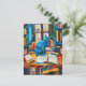 A blue-black cat sits on a desk surrounded by open books in a cosy, scholarly setting. Painting