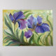 An elegant, lovely painting full of movement on irises, in shades of lilac and blue with long green leaves and steams, on a yellow background with gold small leaves from my floral collection.