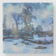 Magic winter night with starry sky and full moon in snowy park with beautiful bridge over small pond, street light and covered in snow trees. Beautiful winter night