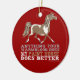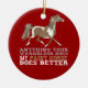 For those who like a little colour in their horses, this paint horse design features the image of a brown and white paint horse trotting with text that says "Anything your warmblood does, my paint horse does better!"