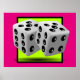 An illustration of a pair of white dice with black dots. Lime green and fuschia pink background. Groovy psychedelic neon colours.