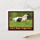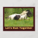 Photo illustration of two black & white Pinto Horses running at a gallop with the flirtatious saying "Let's Run Together" in a wood grain text.