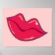 A pair of shining red lips with a a little sparkle and a purple and yellow outline. Subtle white highlights give it a shiny look. Soft pink background.
