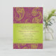 Green paisley designs overprint an amethyst purple background. Customised wedding text sits on a lime green gradient panel. Great for a southeast Asian themed wedding or when you want to make a warm, bold statement. Available in alternate colours with matching products.
